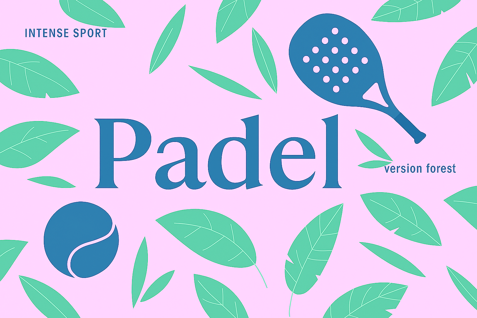 A vibrant design featuring the word 'Padel' in bold blue, surrounded by green leaves on a pink background, symbolizing an updated theme for the sport.