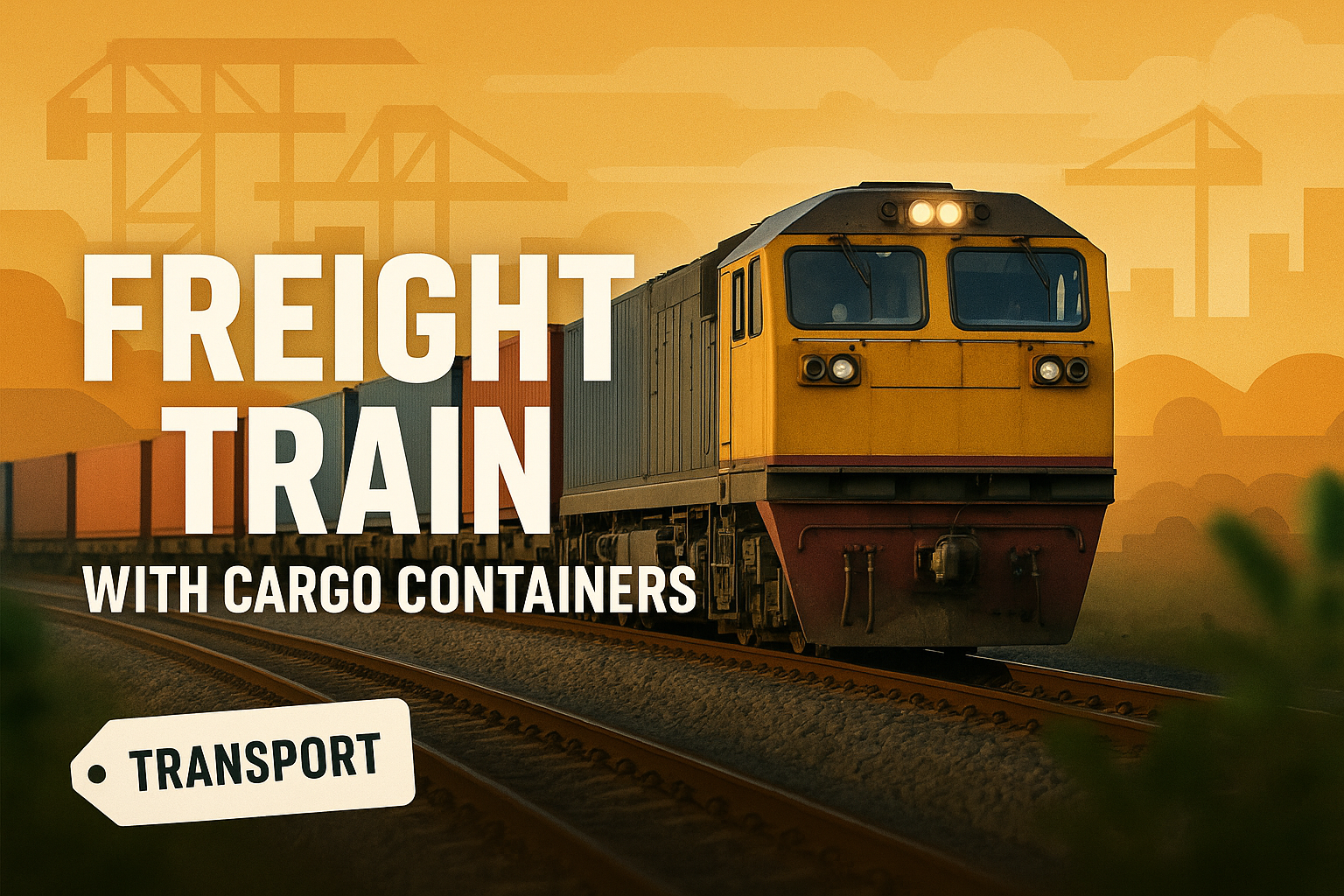 Stylized graphic of a freight train transporting cargo containers, set against a warm sunset backdrop. Ideal for transportation and logistics themes.