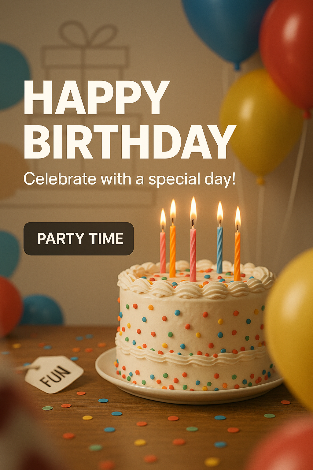 Festive Birthday Celebration Image with Cake and Balloons