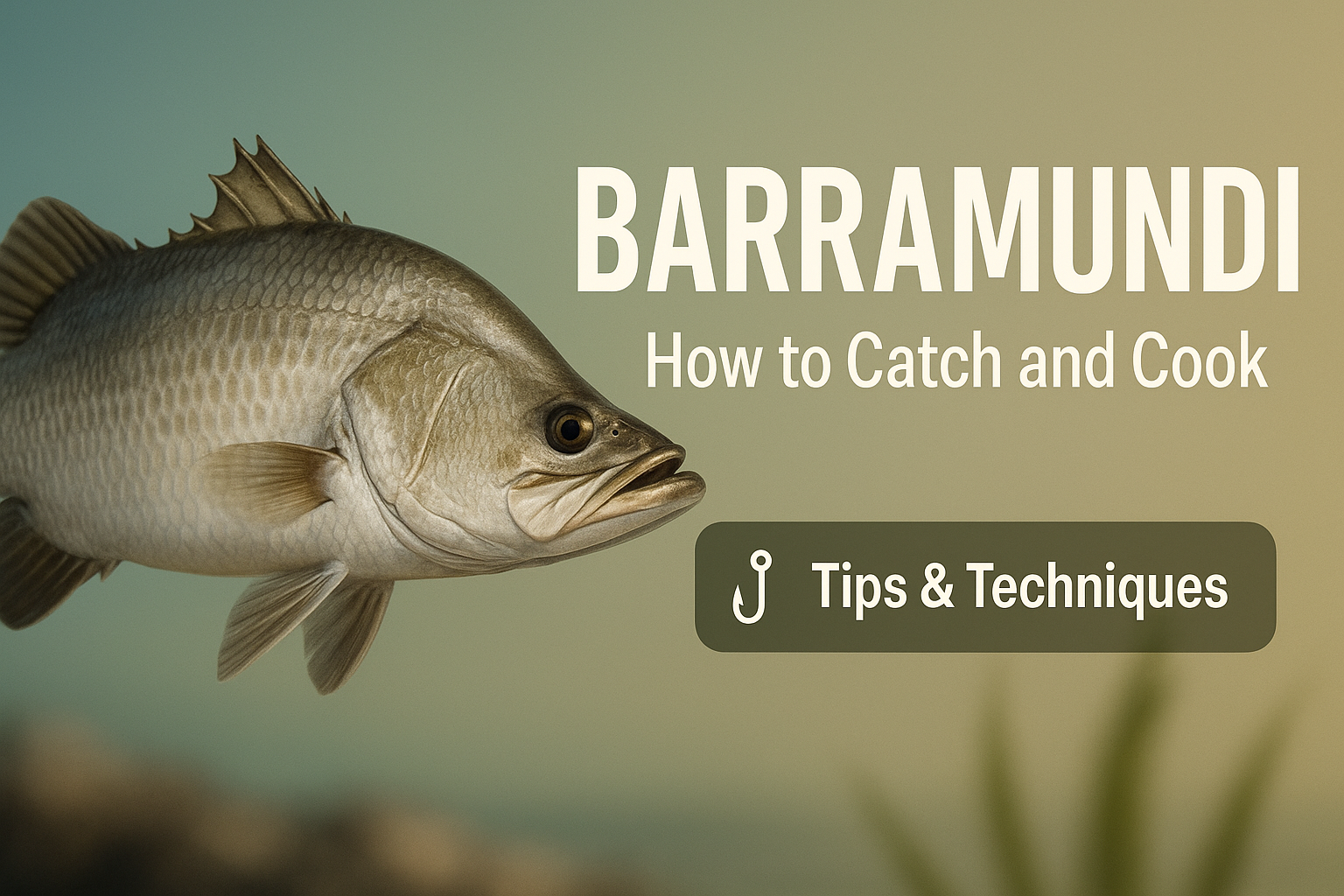 Informative graphic featuring a barramundi fish, offering tips and techniques for catching and cooking. Ideal for fishing enthusiasts and culinary learners.