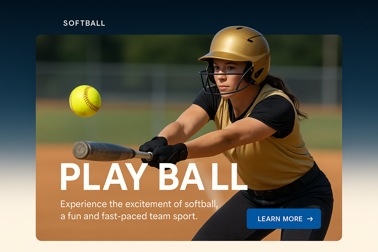 /Collection: /by davooda/Type: PNG/A visually striking illustration featuring a female softball player in action, set against a gradient background. The design includes a bold headline, a brief text block, and a clear call-to-action button.