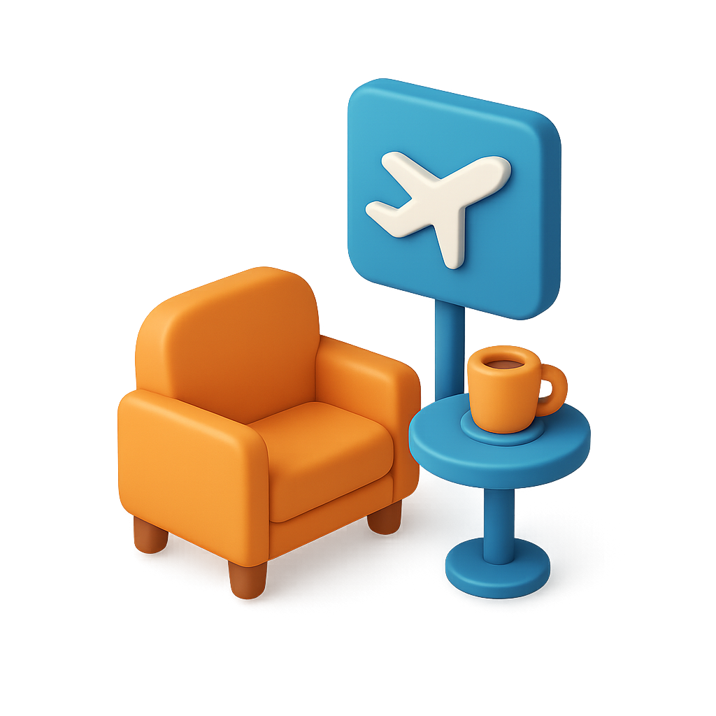 A 3D isometric representation of an airport lounge featuring an orange chair, a blue table with a coffee cup, and a sign with an airplane icon, all on a transparent background.