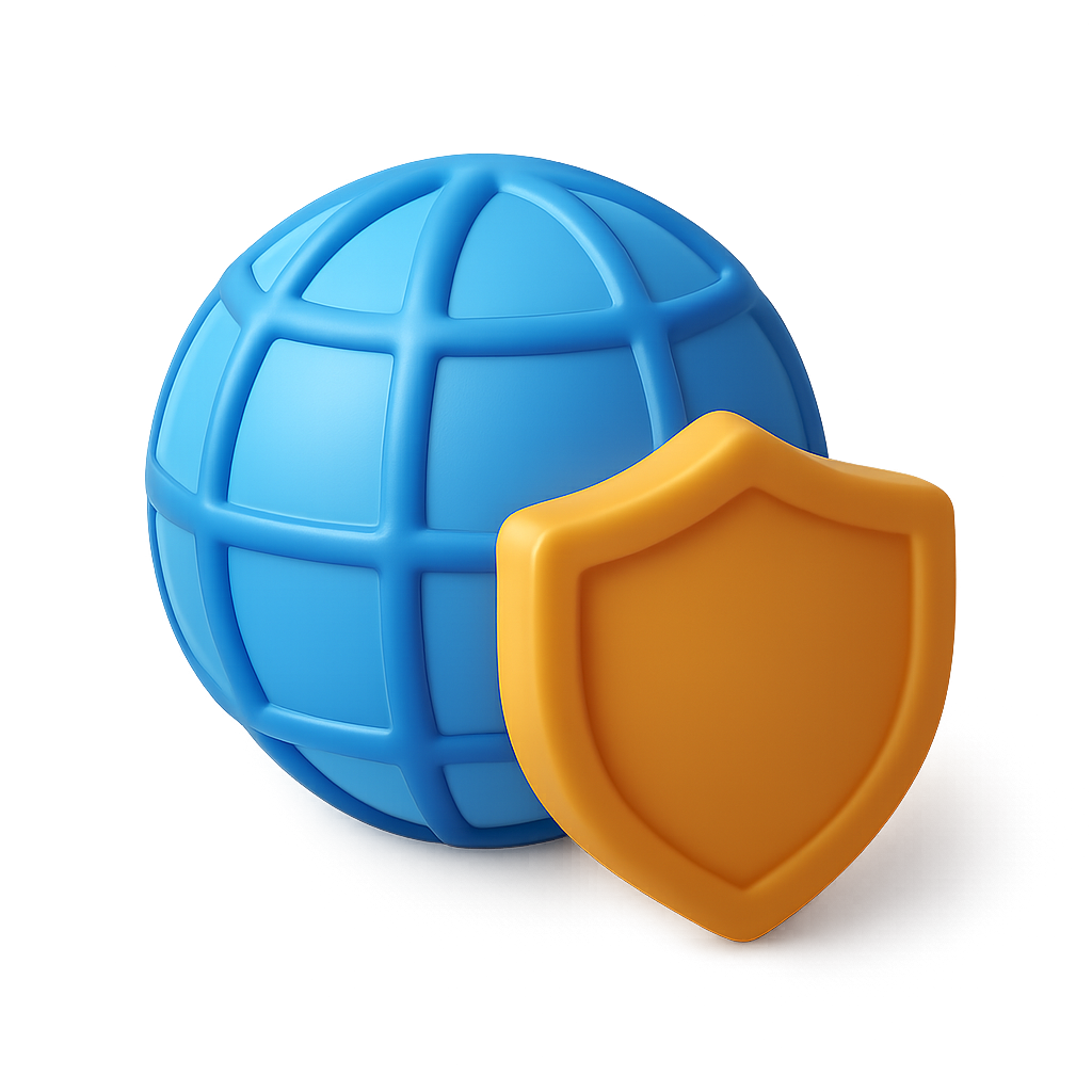 /Collection: /by davooda/Type: PNG/A three-dimensional blue globe with a grid design, accompanied by a prominent orange shield. The icon showcases a modern, isometric style with a transparent background.