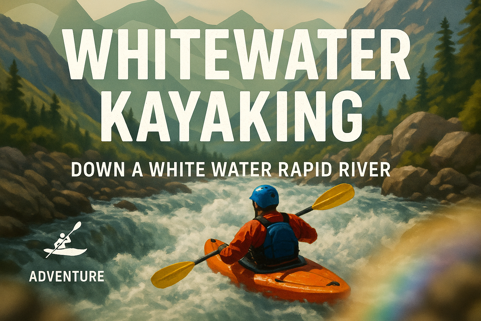 Adventure Illustration Featuring Whitewater Kayaking in a Scenic Landscape