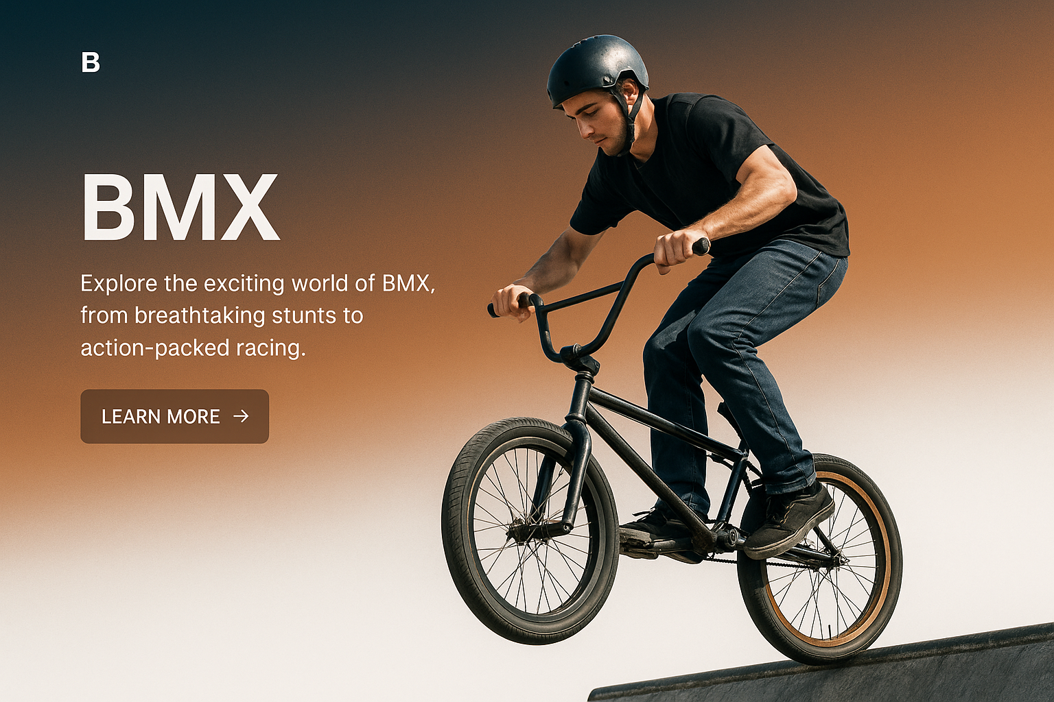 A dynamic BMX-themed webpage featuring a rider performing tricks against a gradient background. The design includes engaging text and a prominent call-to-action button.