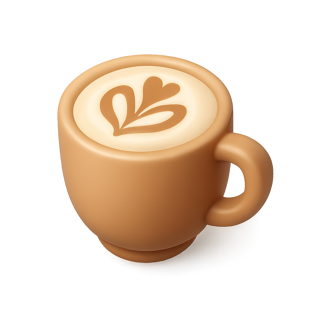 A beautifully crafted 3D icon of a cappuccino cup featuring a heart-shaped latte art design, set against a warm gradient background.