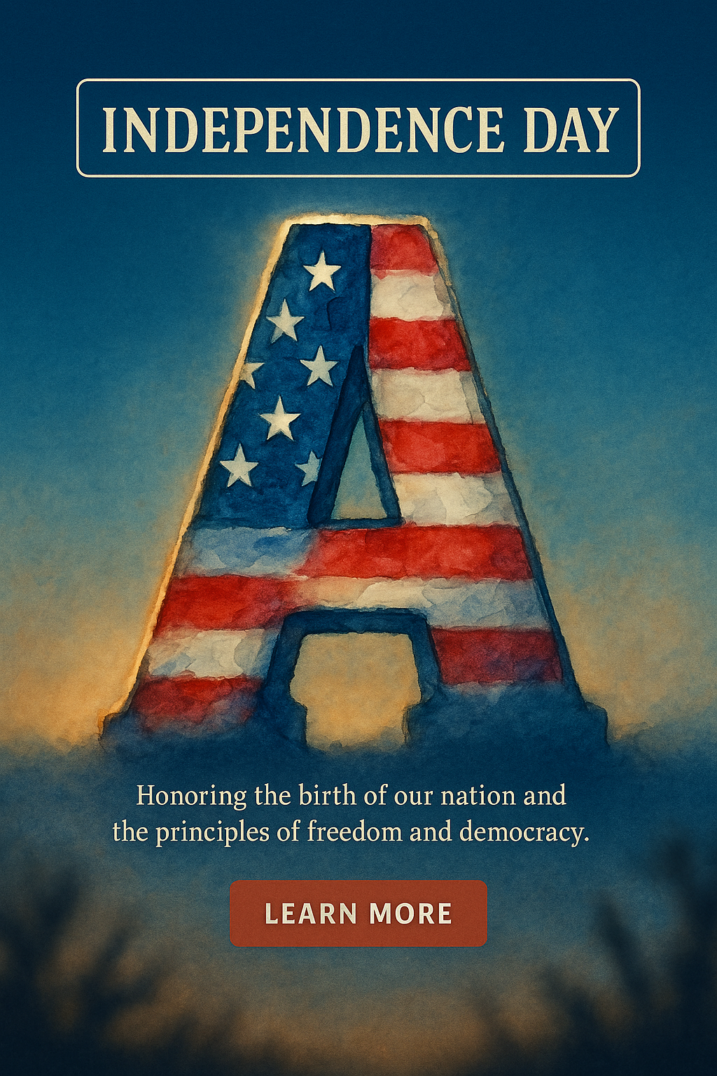 /Collection: /by davooda/Type: PNG/This image is a promotional banner celebrating Independence Day with a stylized letter 'A' featuring the American flag. It aims to evoke feelings of patriotism and national pride.