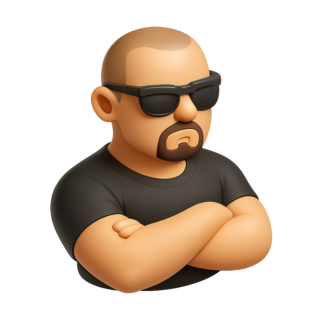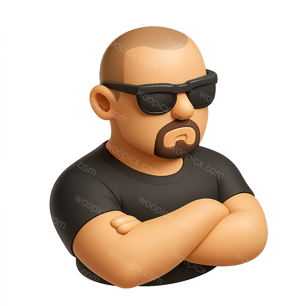A stylized 3D icon of a bouncer, featuring a muscular figure with a stern expression, wearing sunglasses and a black t-shirt, presented in a three-quarter isometric view with a smooth finish.