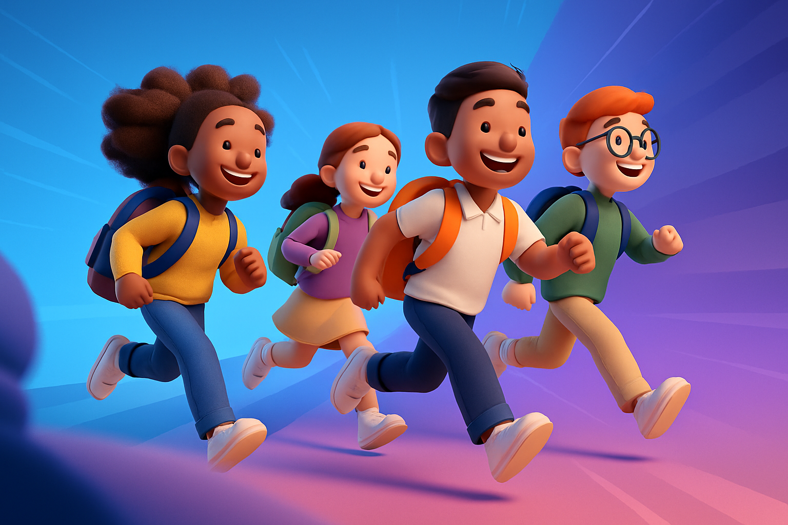 /Collection: /by davooda/Type: PNG/A vibrant 3D illustration of four joyful students with backpacks, running towards school against a smooth gradient background. The scene is filled with energy and dynamic lines radiating from the center.