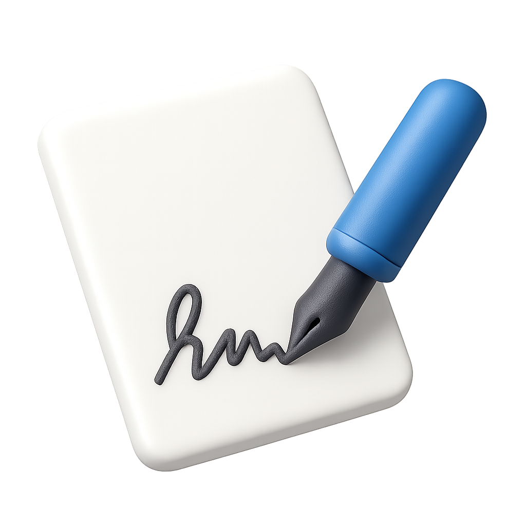 A visually appealing 3D icon featuring a blue marker poised above a white paper with a stylized autograph. The design showcases a three-quarter view and a volumetric feel.