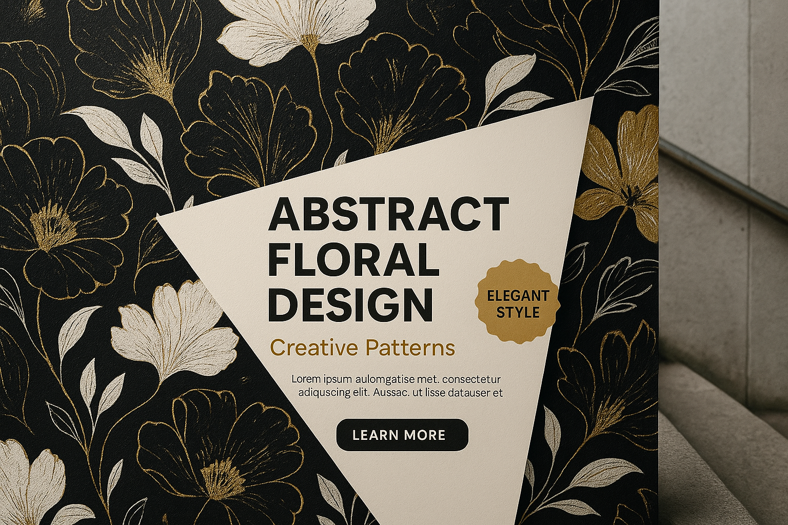 /Collection: /by davooda/Type: PNG/This image features a black background adorned with intricate gold and white floral patterns. The design includes a prominent triangular section with text highlighting an elegant floral theme, creating a striking visual impact.