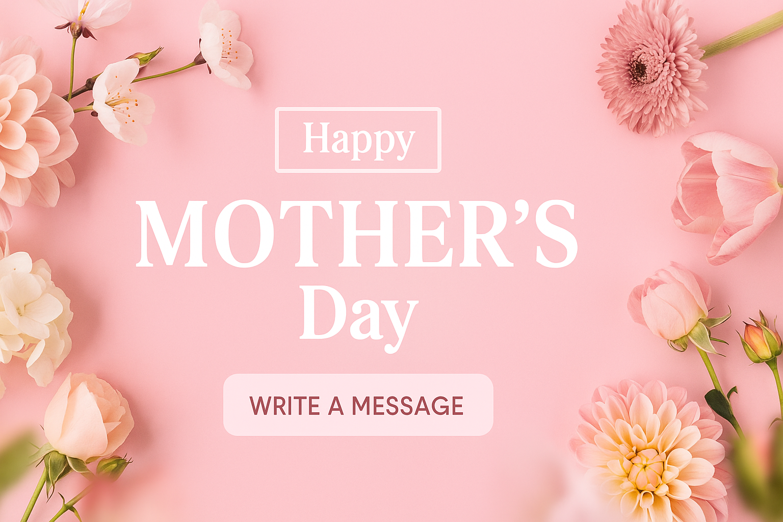A beautifully designed greeting card featuring soft pink flowers on a light pink background. The card reads 'Happy Mother's Day' with space for a personal message, perfect for celebrating special occasions.