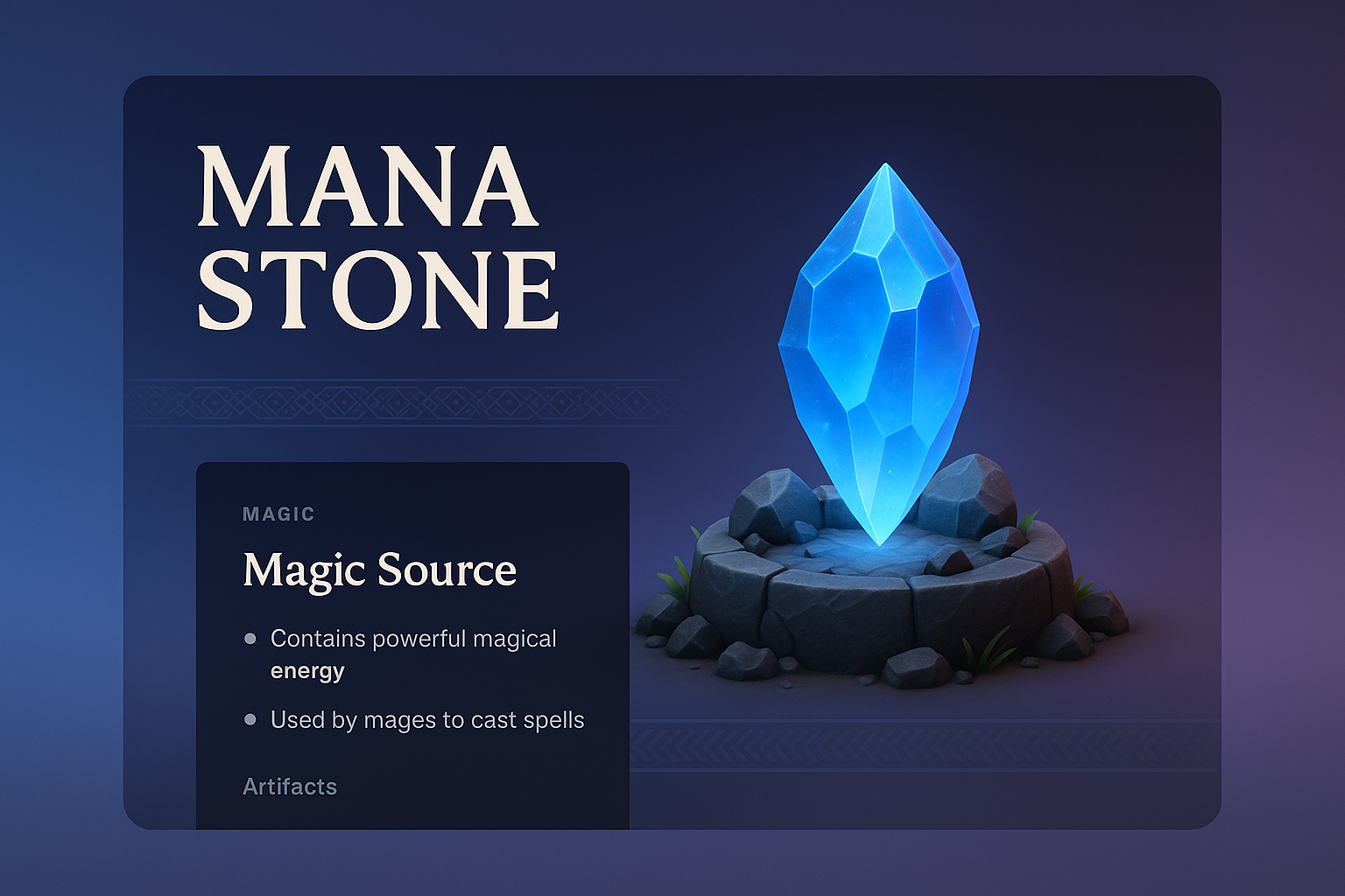 Enchanting 3D Illustration of a Mana Stone with Magic Source Info