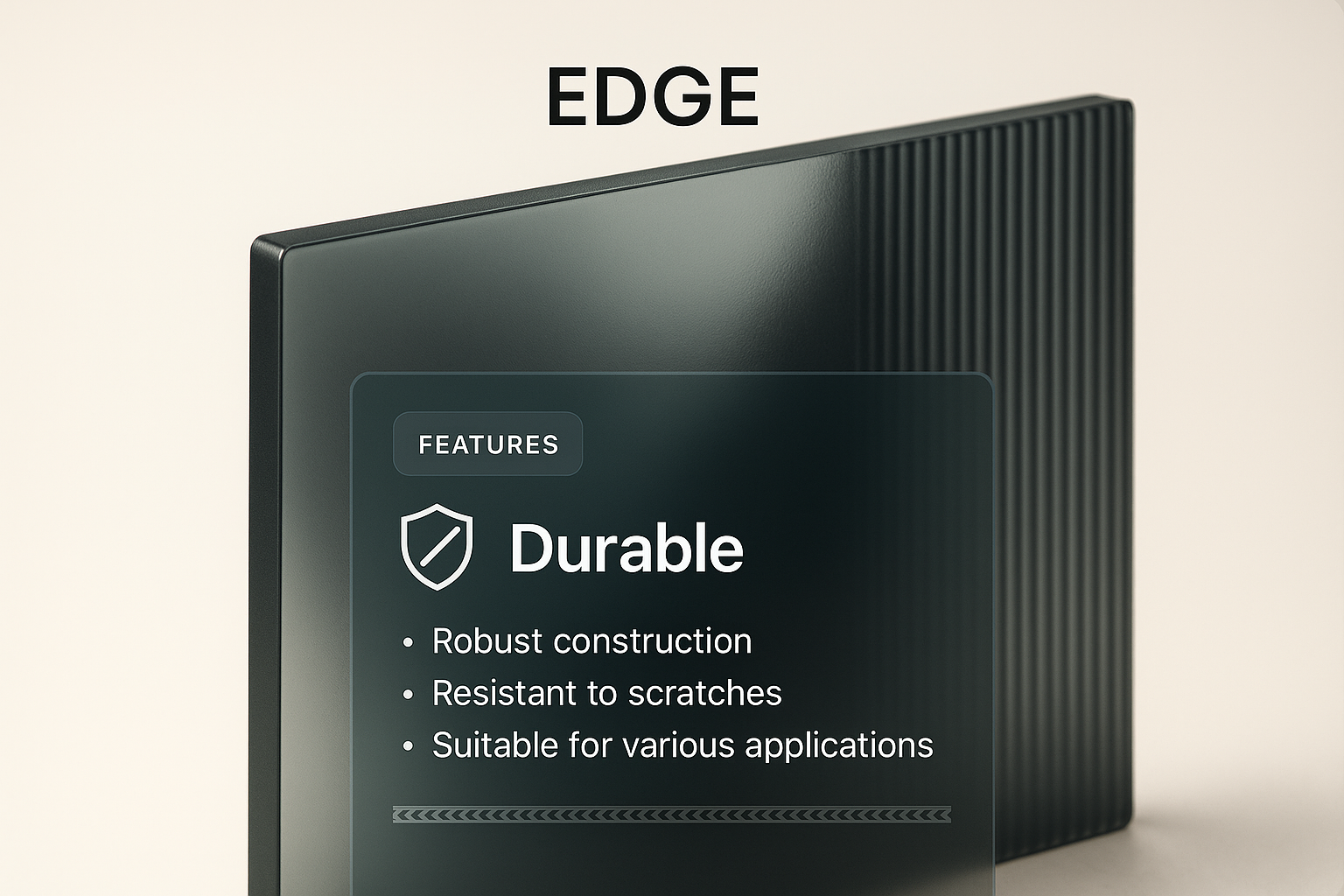A visually appealing product page design featuring the word 'EDGE' prominently. The layout includes a sleek block with features highlighting durability, constructed with a glass-like overlay for a modern touch.
