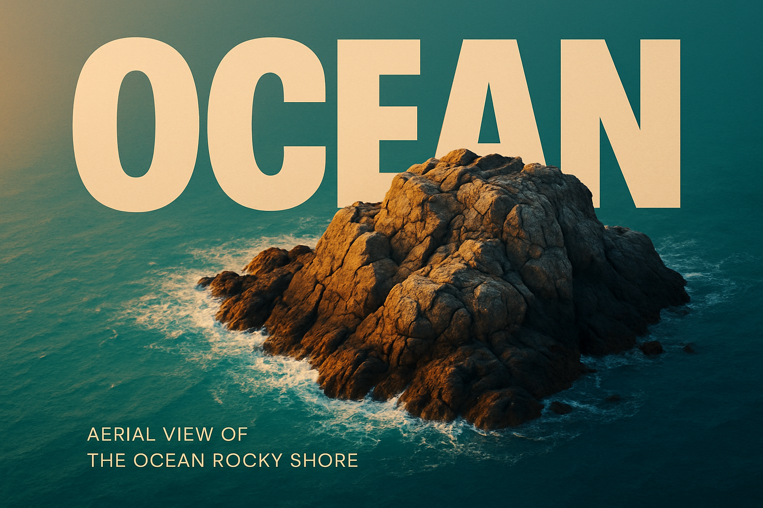 /Collection: /by davooda/Type: PNG/An aerial perspective showcases a rocky ocean shore, highlighted by a massive bold headline. The minimalistic composition features glowing accents and a subtle gradient background, creating a dramatic and modern atmosphere.