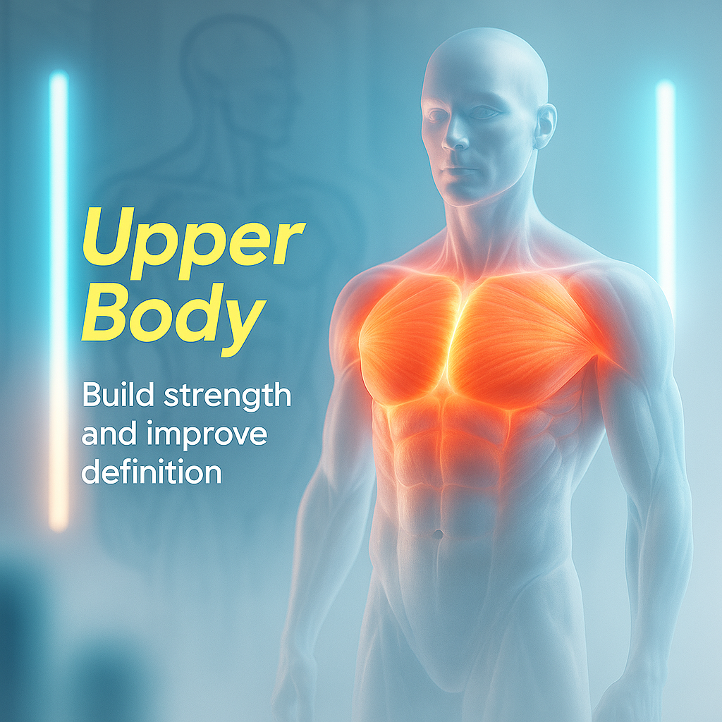 Detailed anatomical graphic highlighting upper body muscles with a focus on strength and definition. Ideal for fitness or educational content.