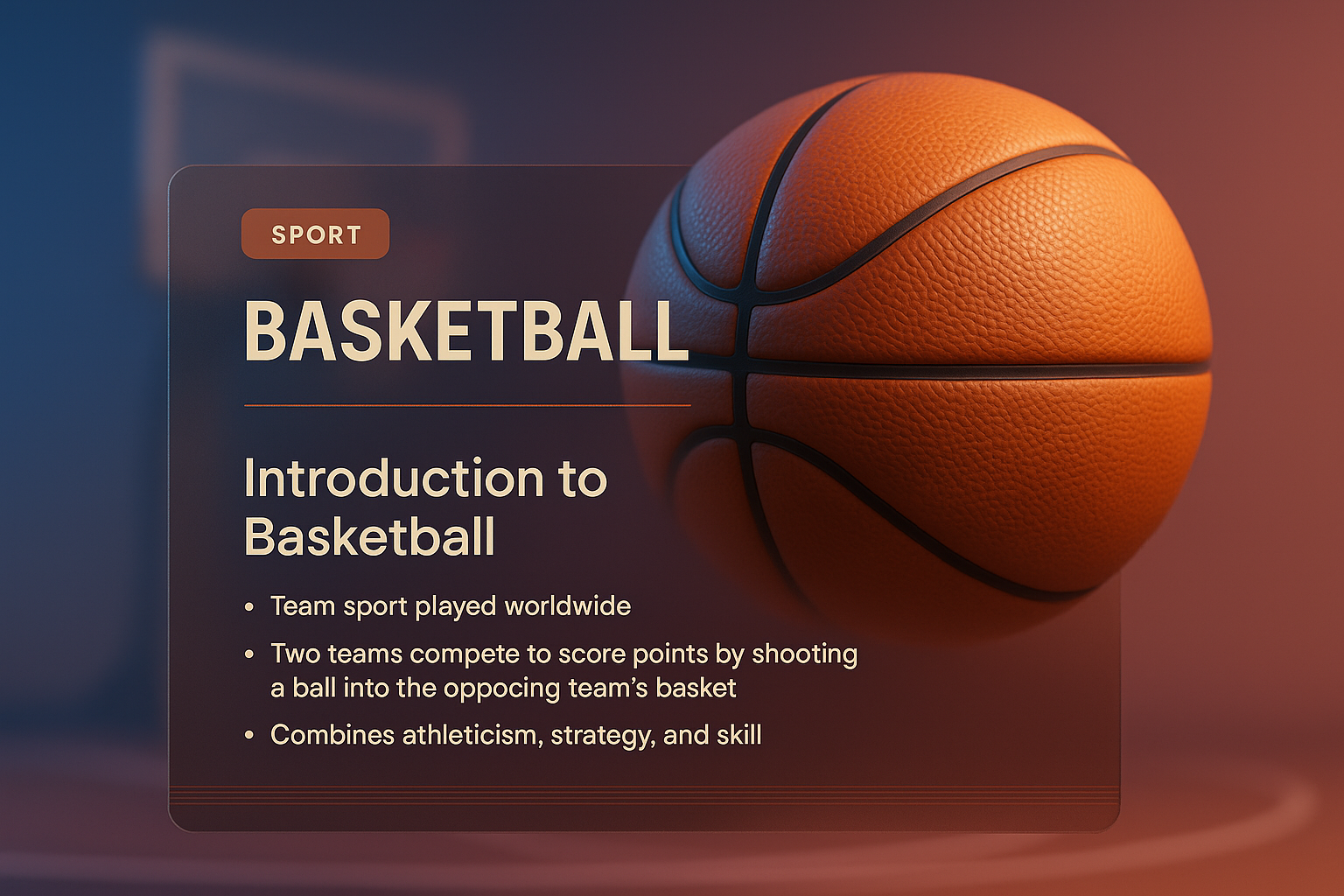 A dynamic 3D illustration of a basketball with informative overlays. The background features a gradient transitioning to a solid color, enhancing the visual depth.