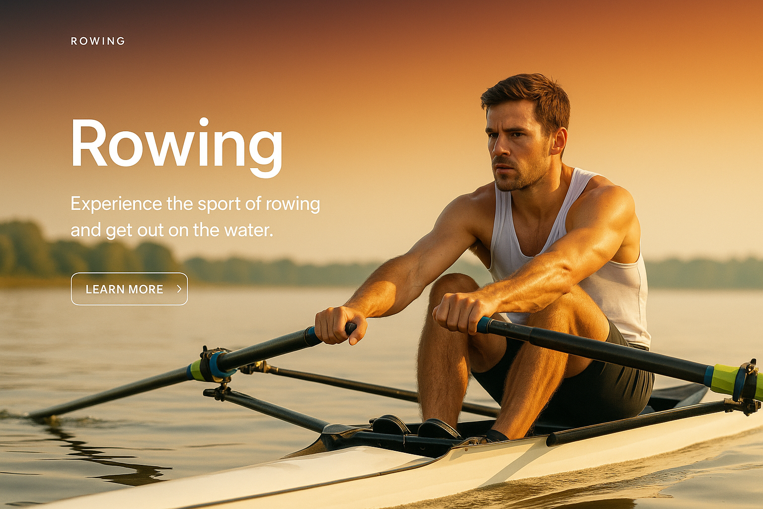 /Collection: /by davooda/Type: PNG/A stylish illustration showcasing a man rowing on water at sunset. The image features a gradient background transitioning from dark to white, with clear text and a call-to-action button.