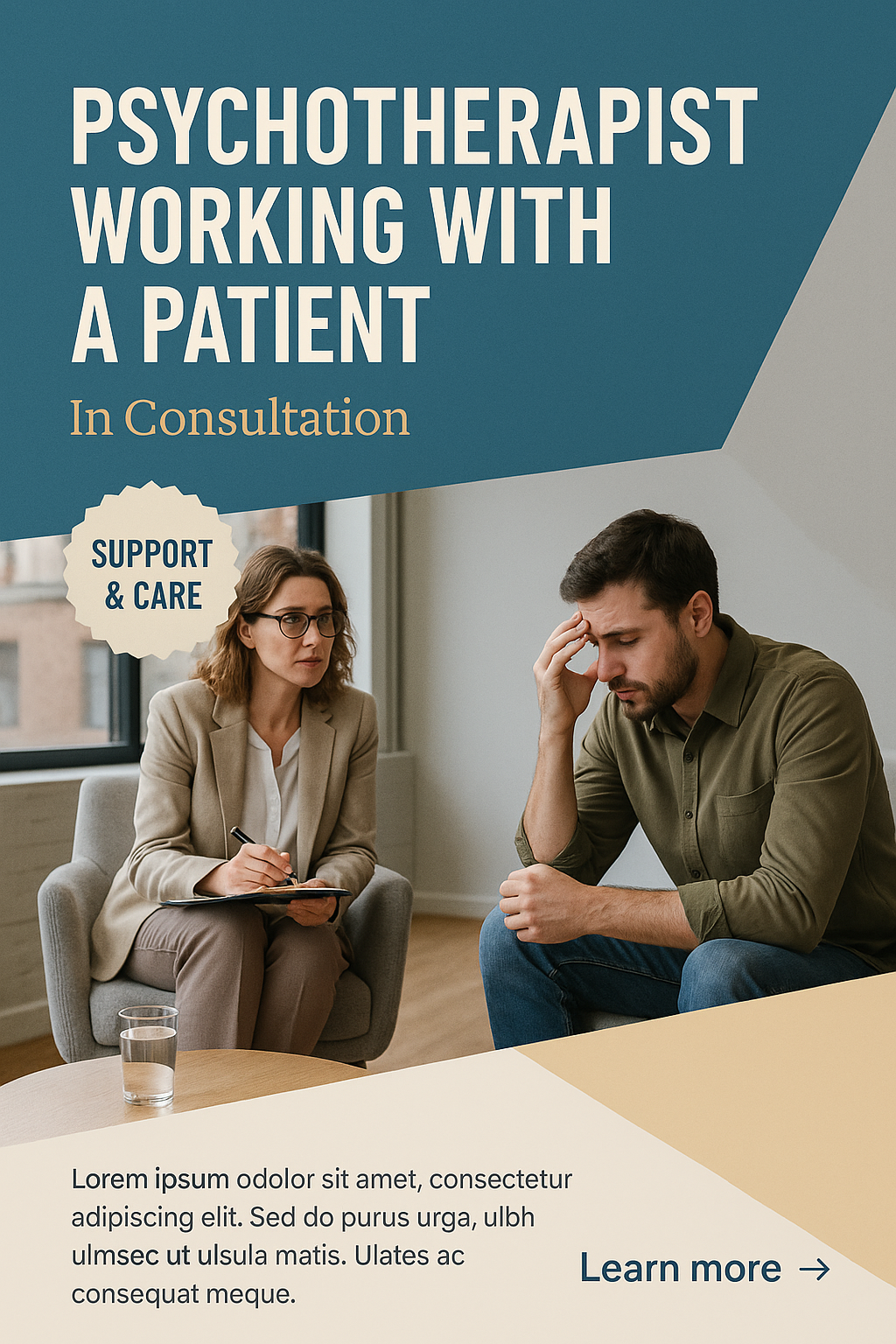A psychotherapist engages with a patient in a cozy office setting, highlighting a supportive atmosphere. The design features layered elements and a professional aesthetic.