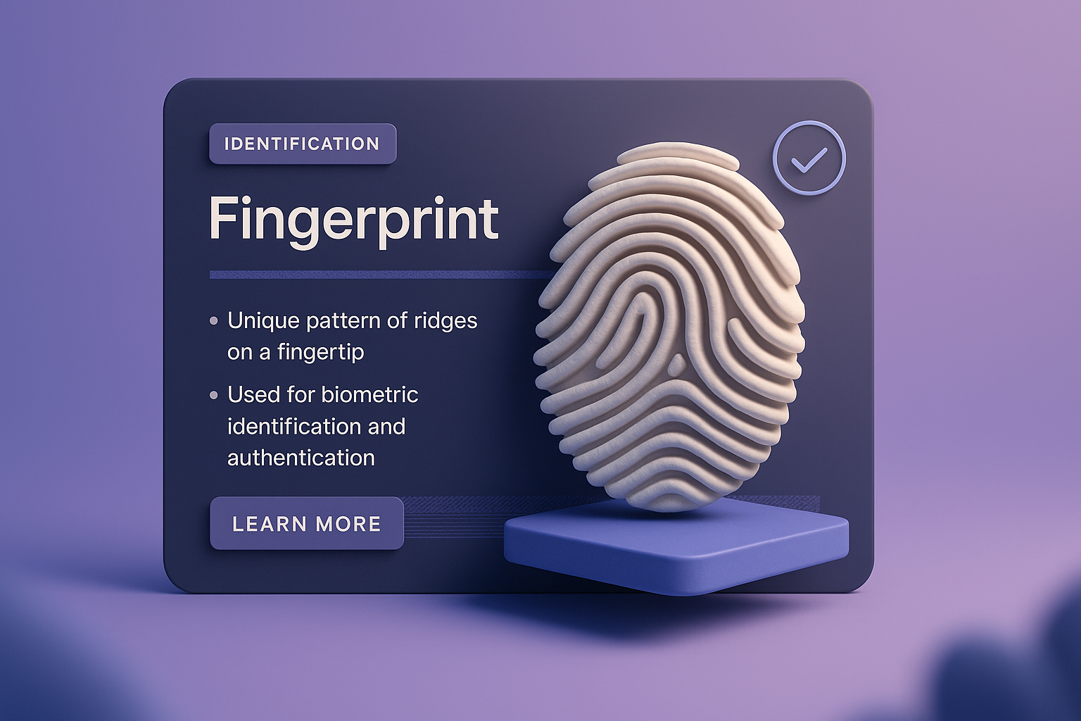 A 3D illustration of a fingerprint showcasing unique ridge patterns, integrated with a dark information panel highlighting its use for biometric identification.