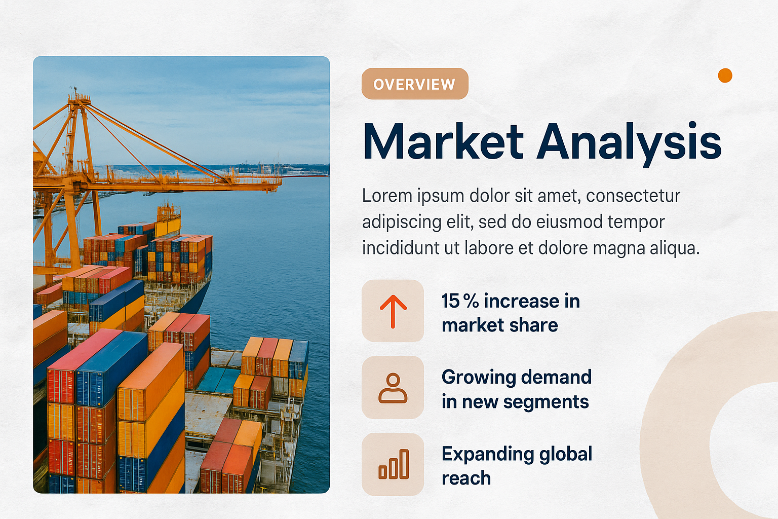 Informative infographic showcasing market analysis with colorful shipping containers and key data points. Ideal for business presentations and reports.