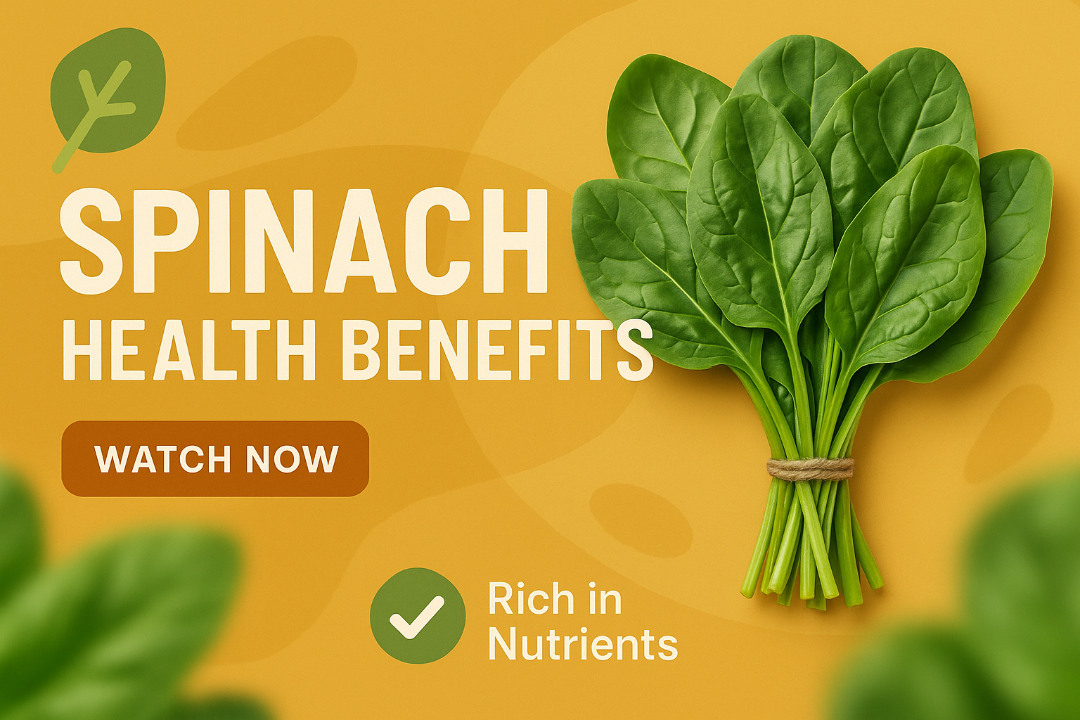 Vibrant and engaging graphic showcasing the health benefits of spinach, featuring fresh spinach leaves against a warm background. Ideal for health and nutrition content.