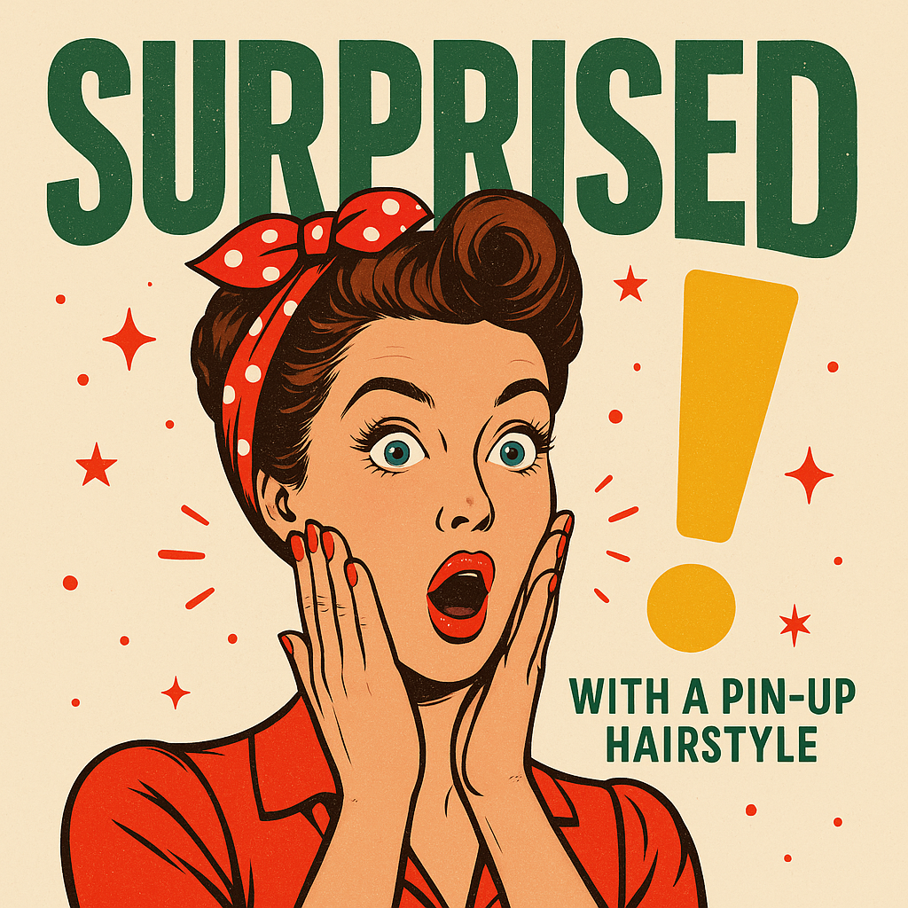 A vibrant retro-style illustration featuring a surprised woman with a pin-up hairstyle, perfect for vintage-themed marketing or social media posts.