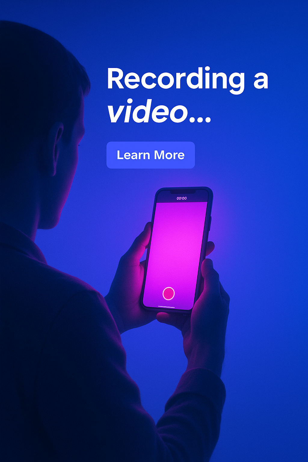 A person holds a phone with a glowing screen while recording a video. The scene is illuminated with a neon-pink light against a solid blue background, creating a captivating atmosphere.