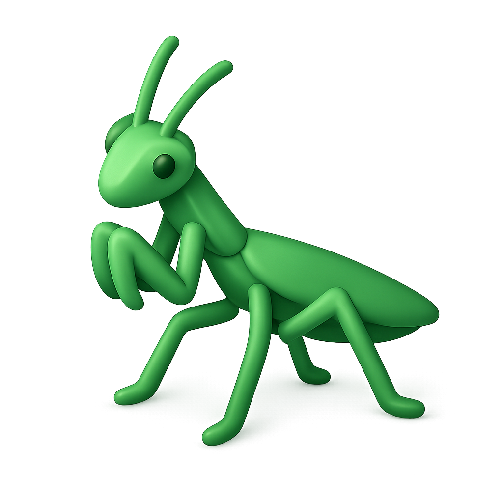 A stylized 3D icon of a mantis in a praying pose, depicted in vibrant green with a smooth, volumetric appearance and transparent background.