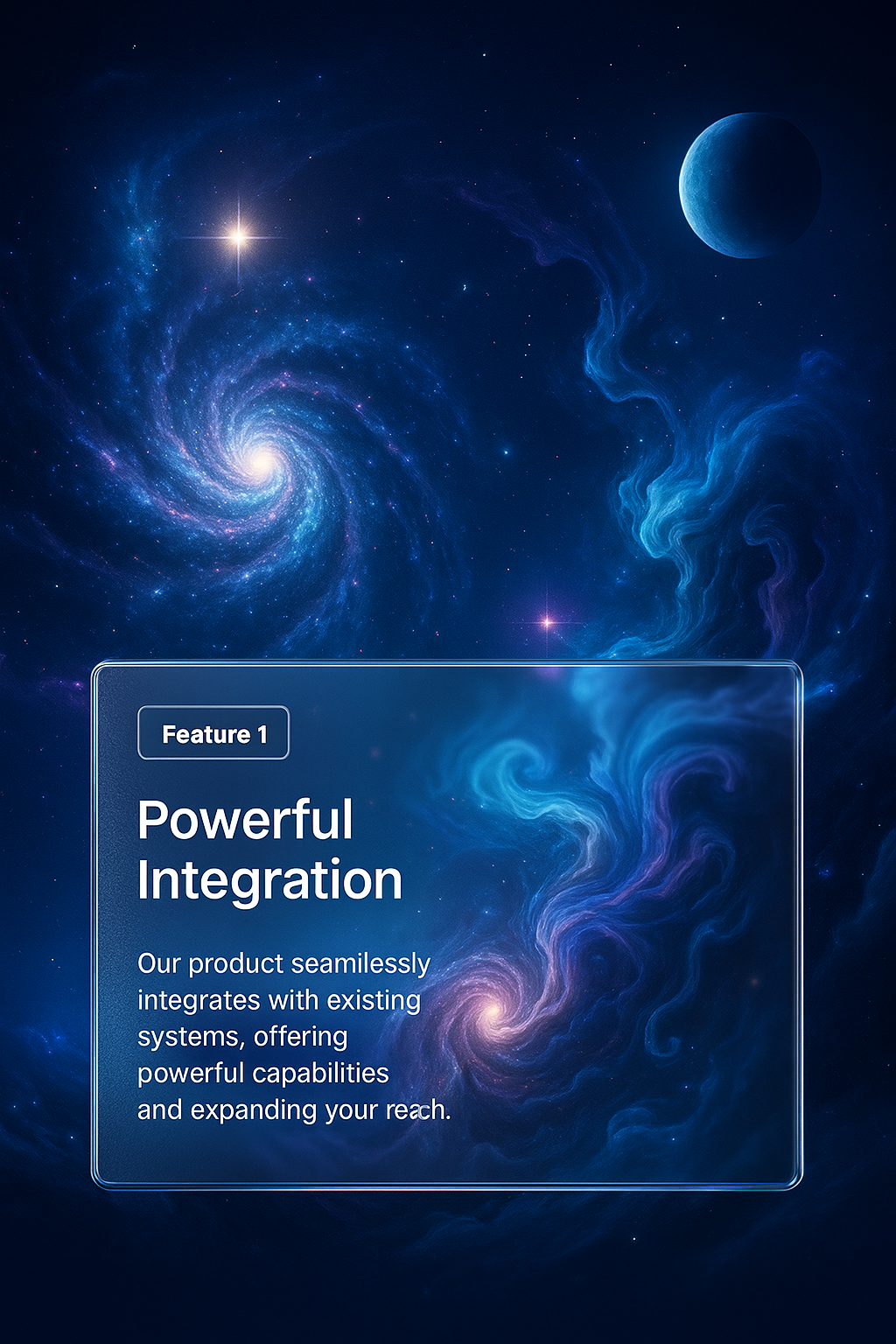 A mesmerizing cosmic scene featuring a swirling galaxy and nebula with a distant planet. The design integrates a transparent block showcasing features against a vibrant space background.