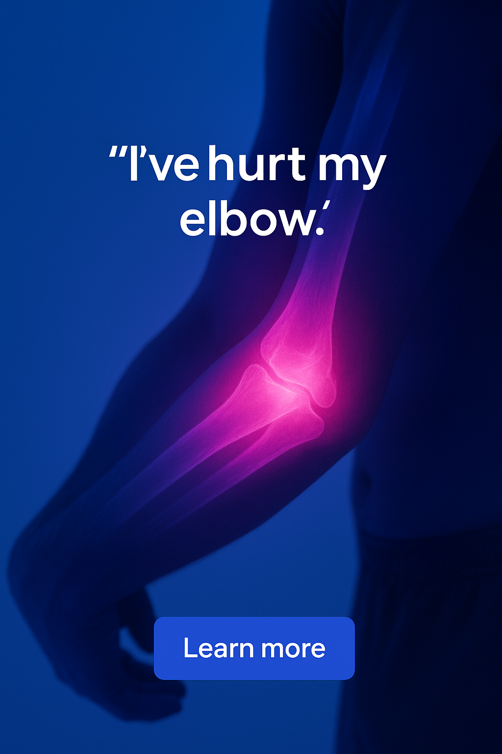 /Collection: /by davooda/Type: PNG/The image features a glowing elbow against a solid blue background, emphasizing an intense neon-pink hue. The composition captures a realistic arm with a focus on the elbow joint, highlighting a relatable injury.