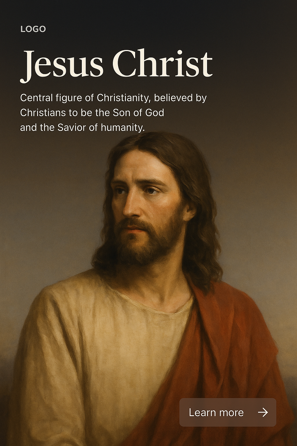 A modern web page design featuring a portrait of Jesus Christ with a gradient background. Includes a logo, title, descriptive text, and a prominent action button.
