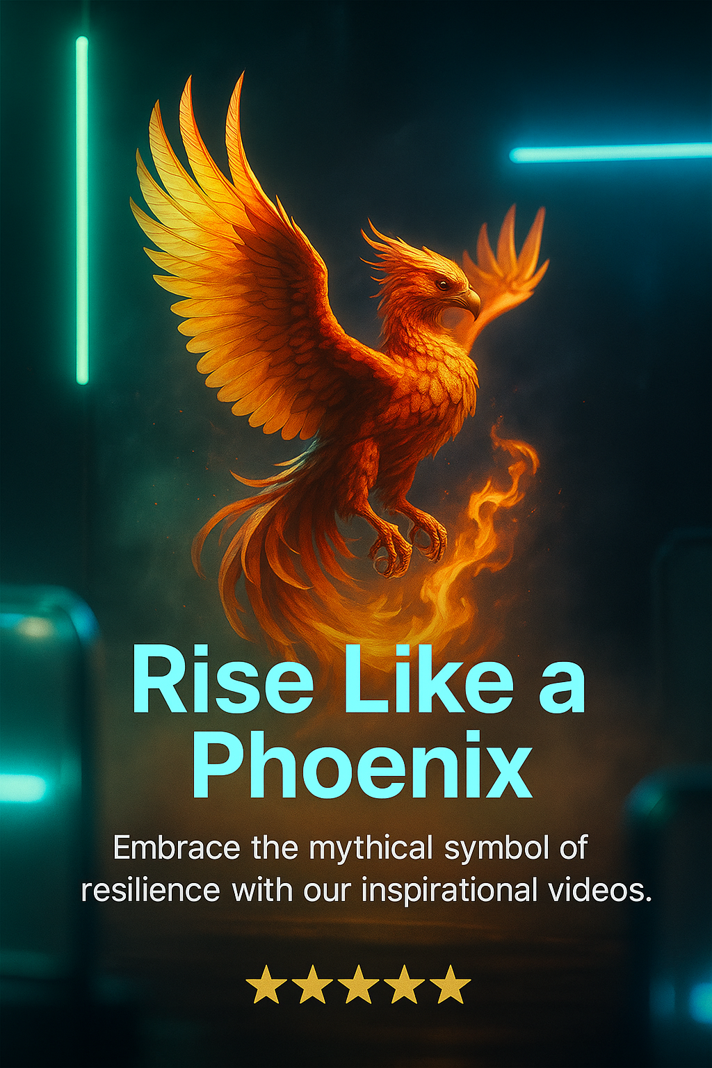 A visually striking carousel slide featuring a majestic phoenix rising with vibrant neon accents, conveying resilience and inspiration. Includes bold text and star ratings.