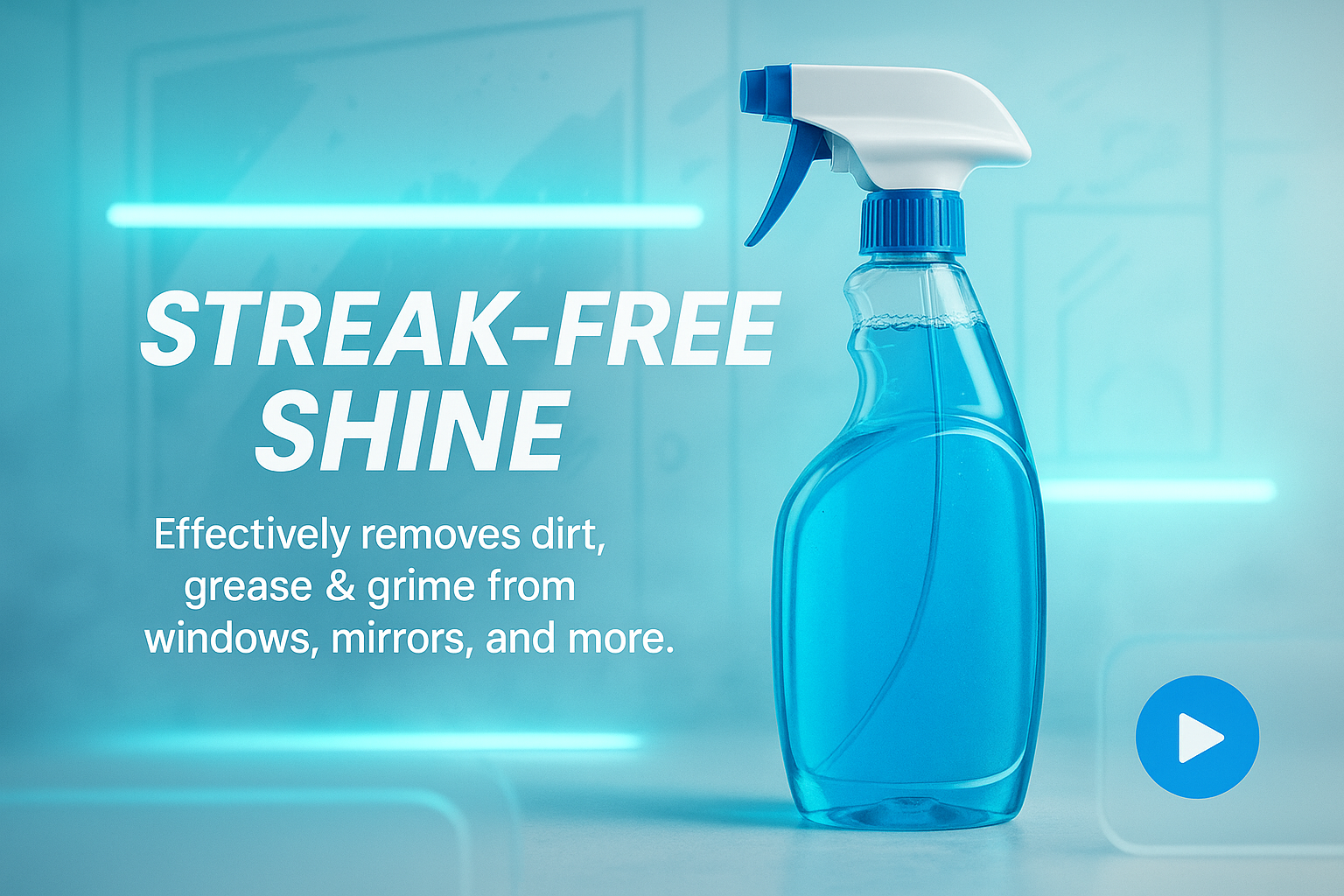 /Collection: /by davooda/Type: PNG/A visually appealing product mockup showcasing a streak-free cleaning solution in a spray bottle. The design features a modern aesthetic with a light blue background, ideal for e-commerce or marketing purposes.