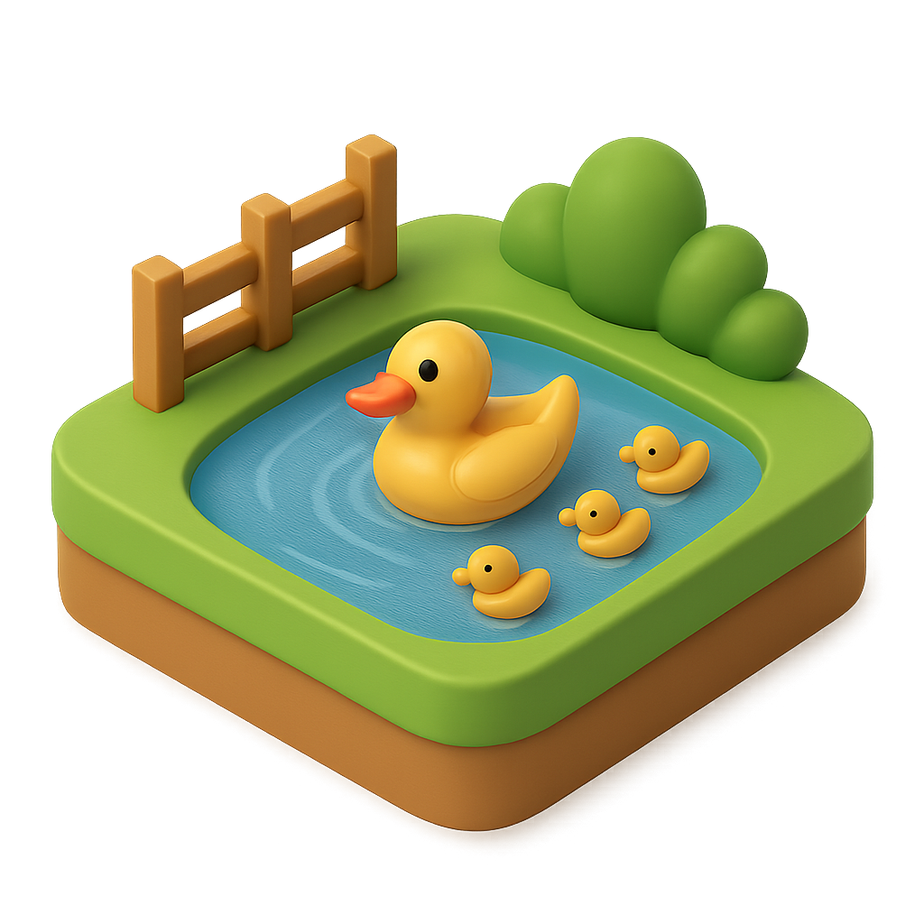 A charming 3D illustration of a duck pond featuring a yellow duck and three ducklings, surrounded by a green landscape and wooden fence, all set against a gradient background.