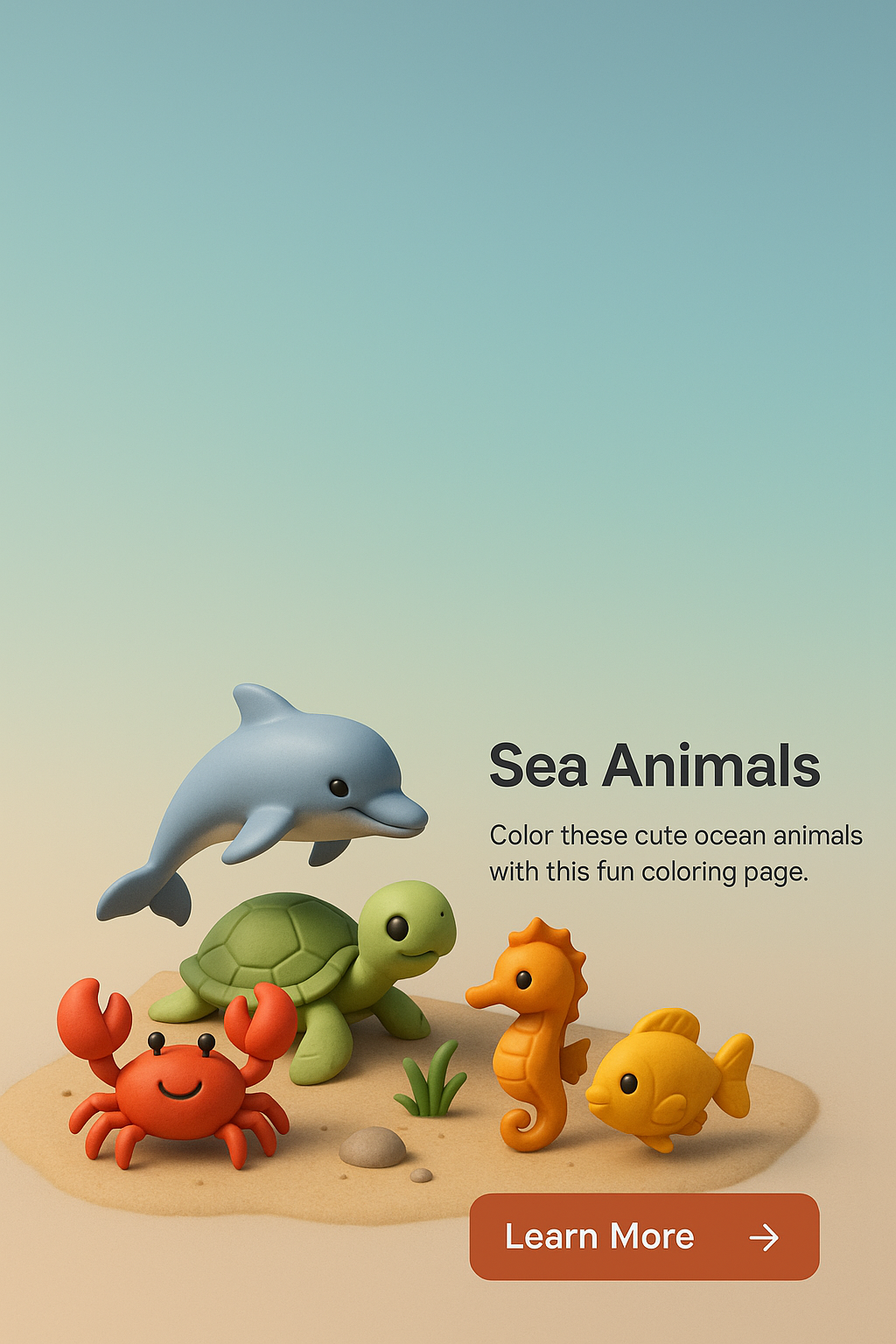 A delightful scene featuring adorable sea animals including a crab, dolphin, turtle, seahorse, and fish. The colorful 3D illustration invites children to engage in creative coloring.