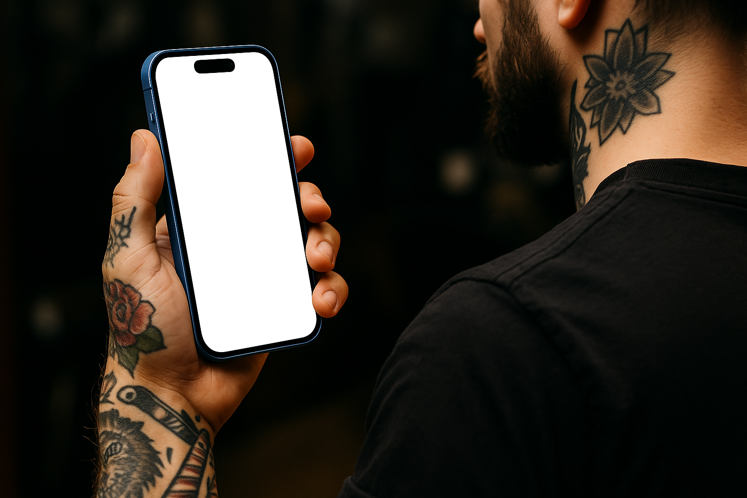 A tattooed barber is holding a blue phone vertically, showcasing a blank white screen. The shot is taken from behind, focusing on the phone and the intricate tattoos on the man's neck.