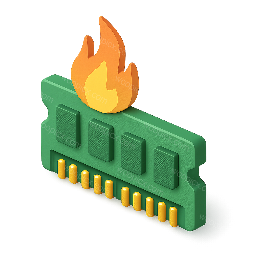 /Premium/Collection: /by davooda/Type: PNG/A visually striking 3D icon of a RAM module featuring a flame on top, symbolizing speed and performance. The design emphasizes a playful yet modern aesthetic with vibrant colors.