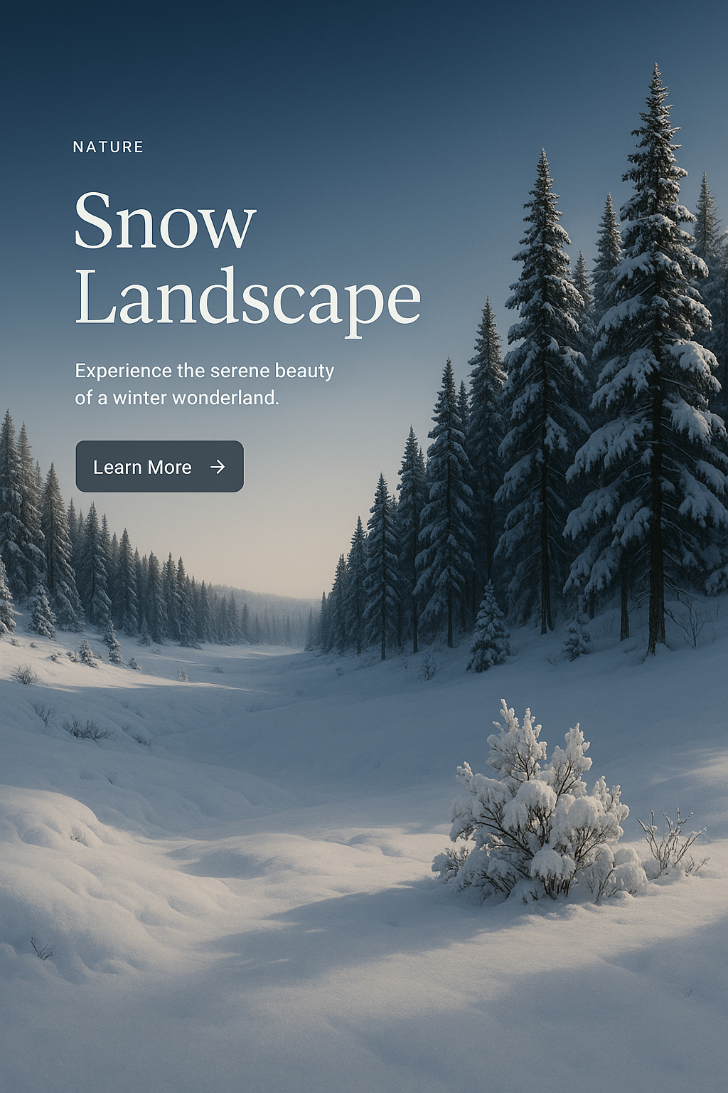 /Collection: /by davooda/Type: PNG/A serene winter landscape featuring snow-covered trees and a gentle valley, with a clear call-to-action button inviting viewers to learn more about the scene.