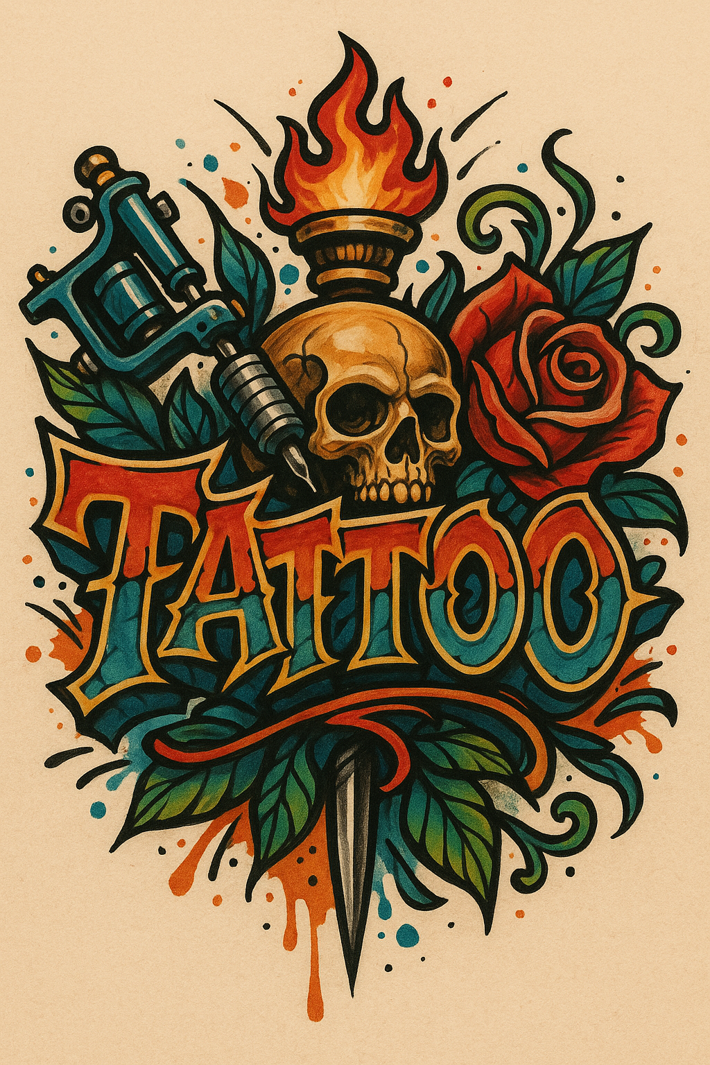 This vibrant tattoo design features a skull, rose, and tattoo machine, emphasizing classic tattoo elements. Ideal for tattoo artists and enthusiasts.