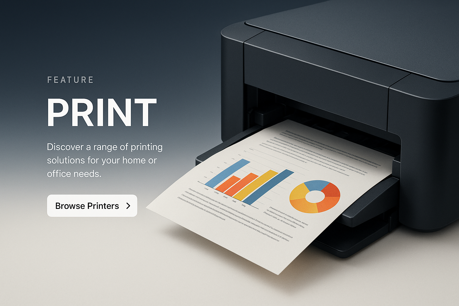 A sleek web design layout showcasing a printer with printed materials, including graphs and charts. The gradient background enhances the modern aesthetic.