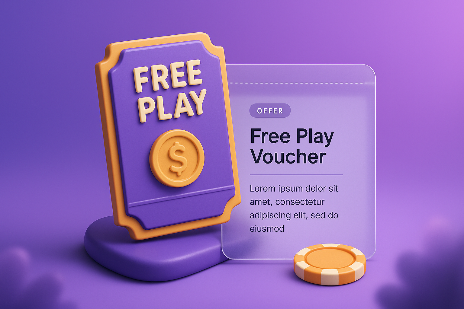 /Collection: /by davooda/Type: PNG/A vibrant 3D illustration of a 'Free Play Voucher' against a smooth gradient background. The voucher features a dollar symbol and a translucent info block with additional details.