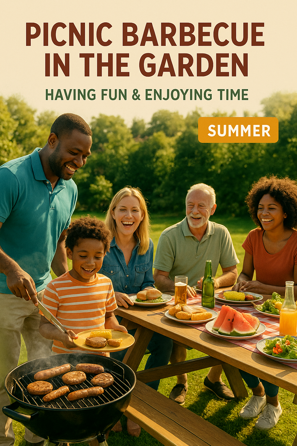 Vibrant image of a family enjoying a picnic barbecue in a garden setting, showcasing joyful interactions and delicious food, perfect for summer-themed content.