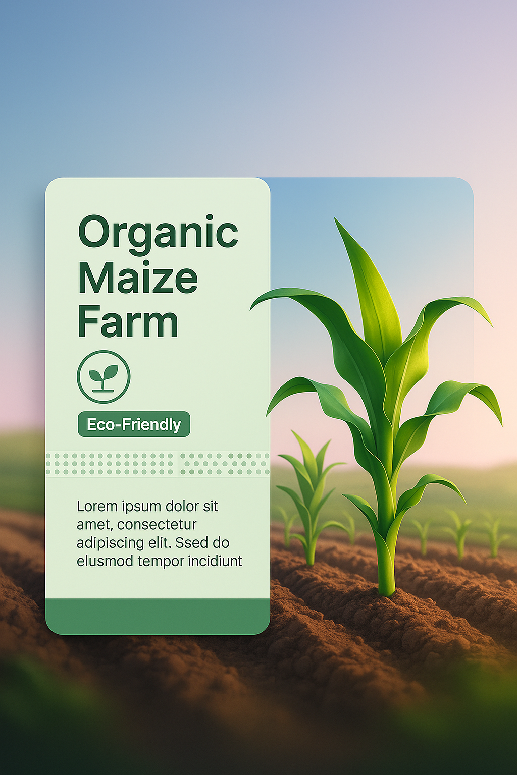 /Collection: /by davooda/Type: PNG/A visually appealing 3D illustration of an organic maize farm featuring green corn plants. The scene includes a gradient background and eco-friendly labels, emphasizing agricultural beauty.