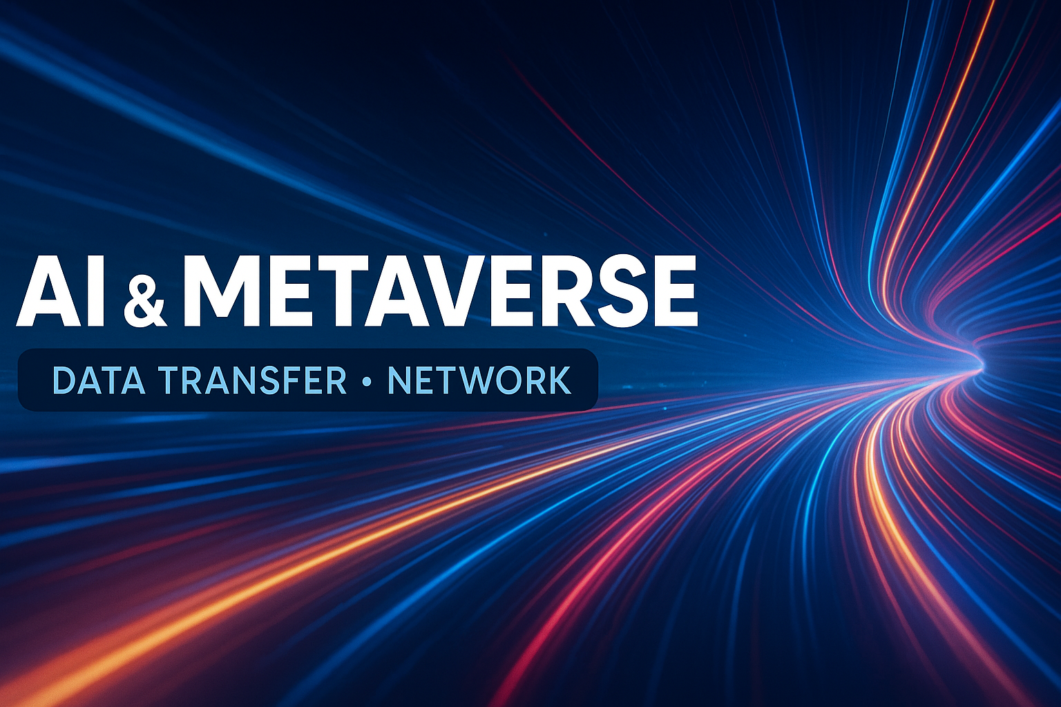 Dynamic graphic illustrating AI and metaverse themes with vibrant light trails, suitable for tech-related presentations or marketing materials.