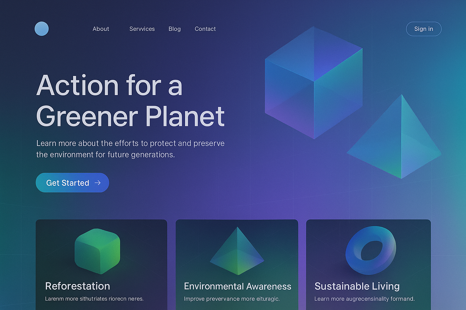 /Collection: /by davooda/Type: PNG/A modern landing page design featuring geometric shapes with gradients, focusing on environmental themes like reforestation and sustainable living. The layout is asymmetrical yet balanced.