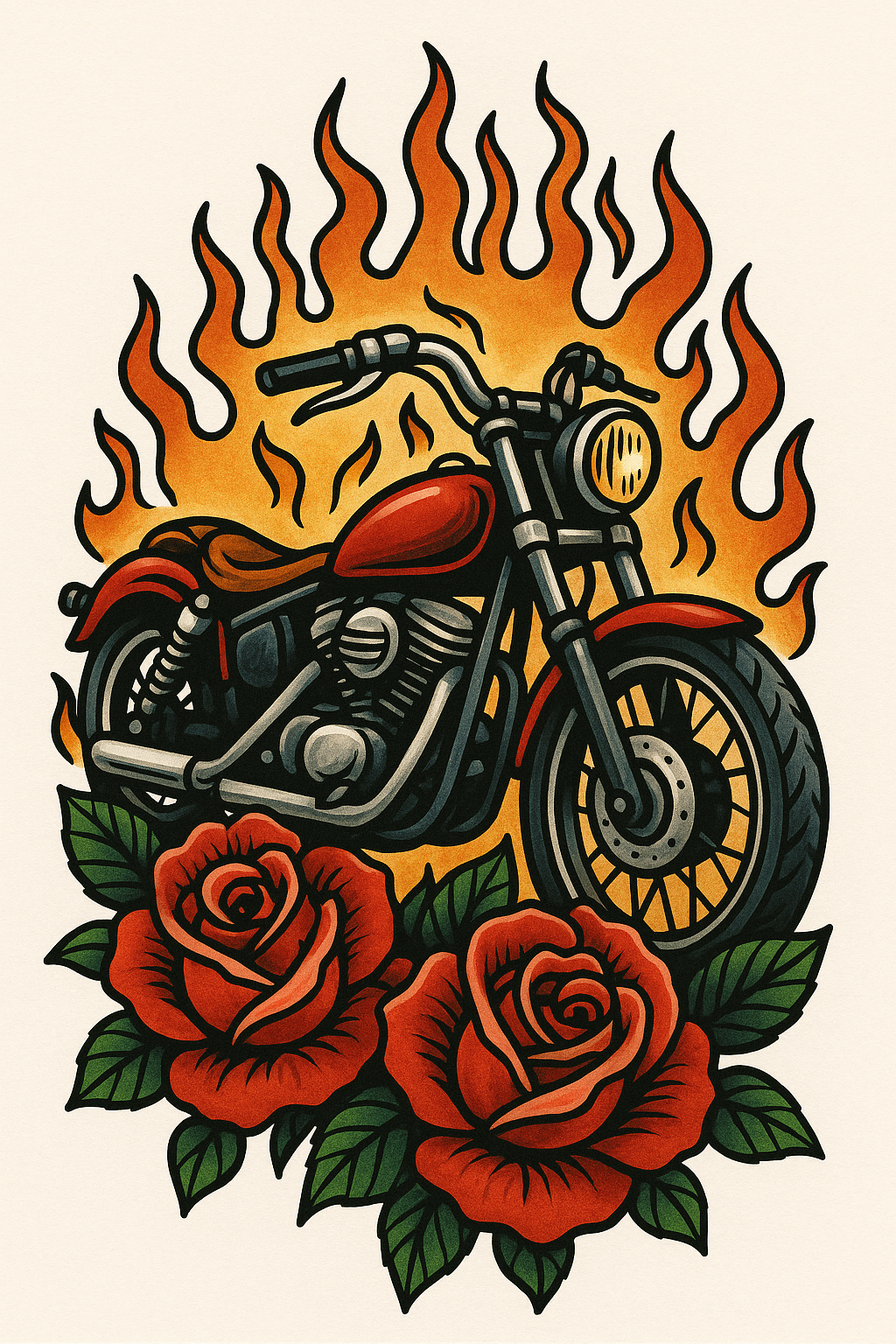 Vintage Motorcycle Illustration with Flames and Roses
