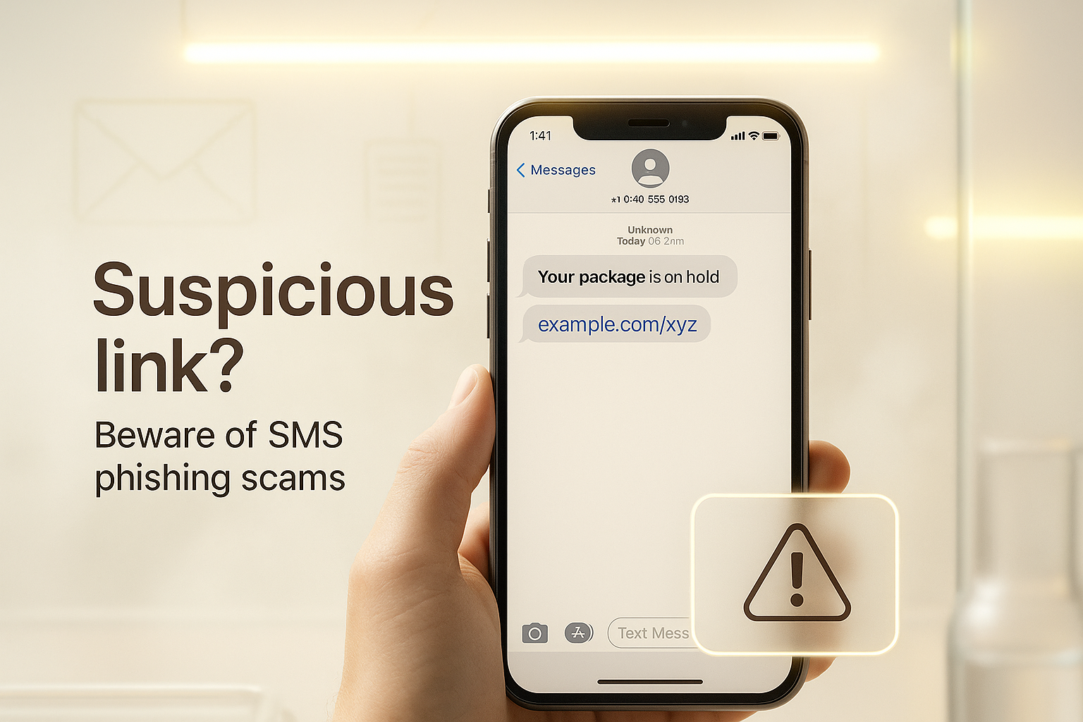 Informative graphic highlighting the dangers of SMS phishing, featuring a phone displaying a suspicious text message. Ideal for awareness campaigns on digital security.