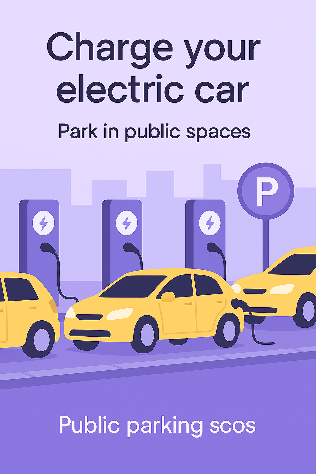 Colorful and modern graphic showcasing electric car charging stations in a public parking setting, ideal for promoting sustainable transport solutions.