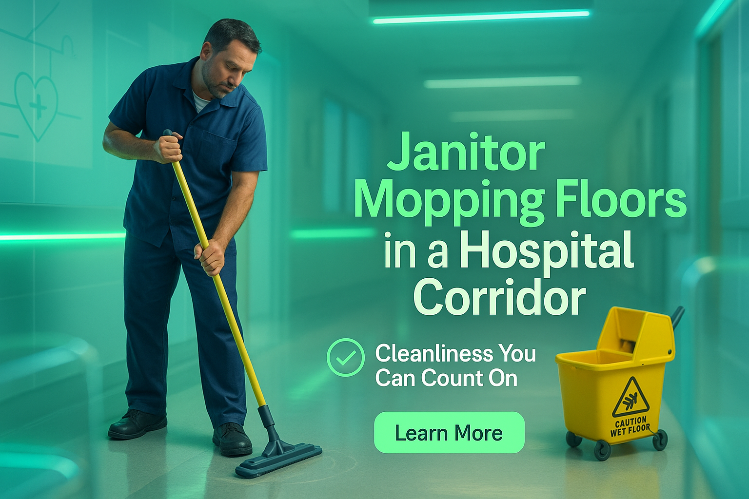 /Collection: /by davooda/Type: PNG/A visually engaging image showcasing a janitor mopping floors in a hospital corridor. The bright and clean environment emphasizes the importance of hygiene and cleanliness in healthcare settings.